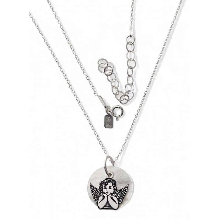 Gargantilla nácar Angelito de la guarda de plata, fabricada de forma artesanal y en PLATA de LEY de 925 milésimas. Nuestro catálogo esta en constante actualización. Disponemos de STOCK PERMANENTE.