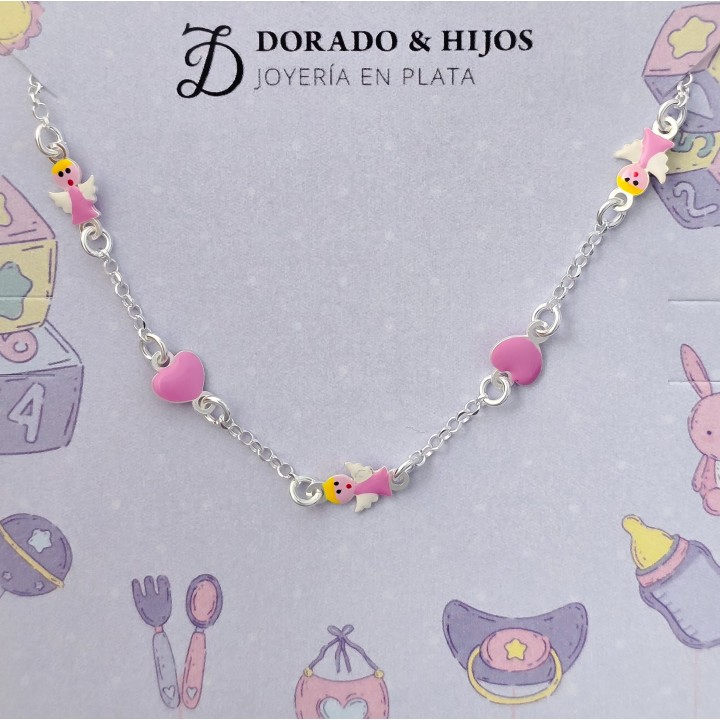 Pulsera infantil angelitos corazones de plata, fabricada de forma artesanal y en PLATA de LEY de 925 milésimas. Nuestro catálogo esta en constante actualización. Disponemos de STOCK PERMANENTE.