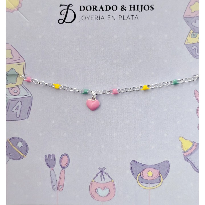 Pulsera infantil corazón de plata, fabricada de forma artesanal y en PLATA de LEY de 925 milésimas. Nuestro catálogo esta en constante actualización. Disponemos de STOCK PERMANENTE.