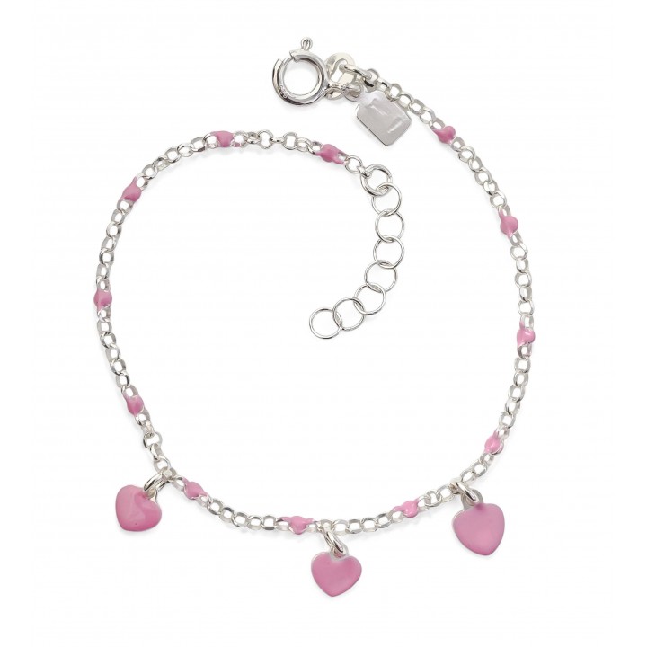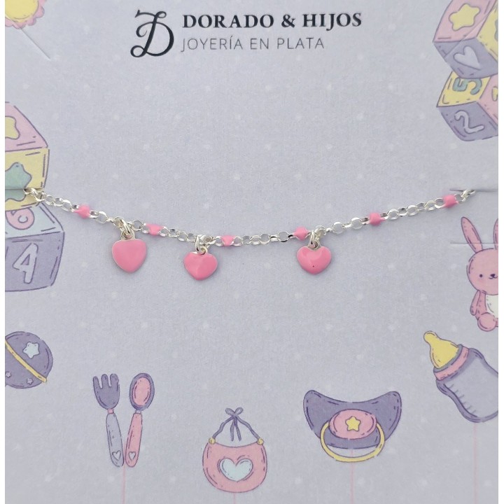 Pulsera infantil corazones de plata, fabricada de forma artesanal y en PLATA de LEY de 925 milésimas. Nuestro catálogo esta en constante actualización. Disponemos de STOCK PERMANENTE.