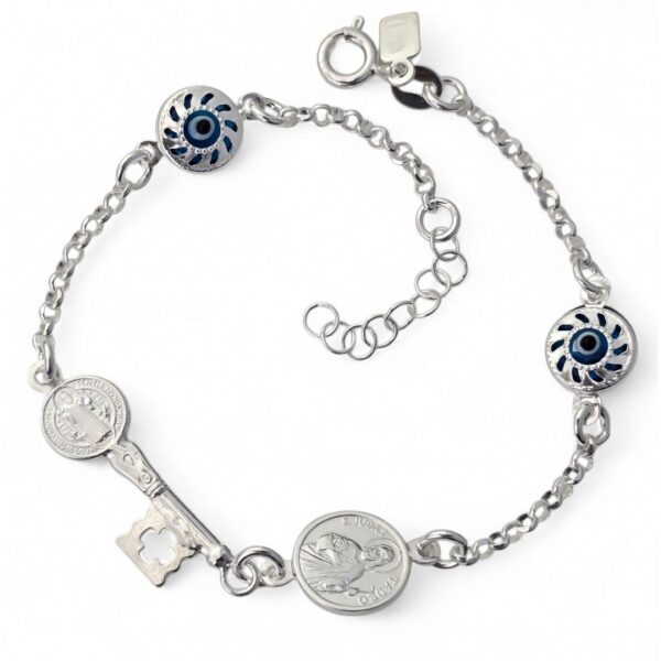 Pulsera ojo turco , llave San Benito y San Judas Tadeo de plata, fabricada de forma artesanal y en PLATA de LEY de 925 milésimas. Nuestro catálogo esta en constante actualización. Disponemos de STOCK PERMANENTE.