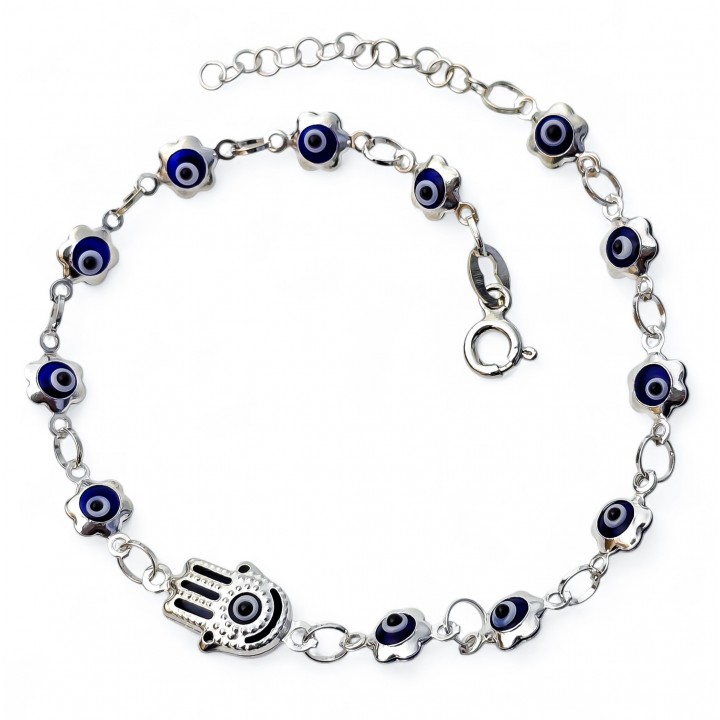 Pulsera ojo turco mano de Fátima de plata, fabricada de forma artesanal y en PLATA de LEY de 925 milésimas. Nuestro catálogo esta en constante actualización. Disponemos de STOCK PERMANENTE.
